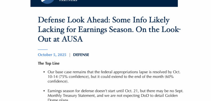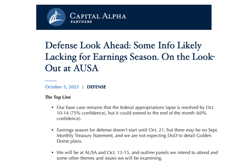 On today’s Look Ahead program, sponsored by HII, Byron Callan of the independent Washington research firm Capital Alpha Partners joins Defense & Aerospace Report Editor Vago Muradian to discuss the government shutdown and how long it will last; how this showdown might be different than earlier ones; why Wall Street’s reaction is muted; interesting the latest government data; how messaging the meeting President Trump Defense Secretary Pete Hegseth could impact on programs and allied cooperation; takeaways from AeroVironment’s investor day; developing a drone supply chain that’s free of Chinese components; KBR’s spin; and a look at the week ahead.