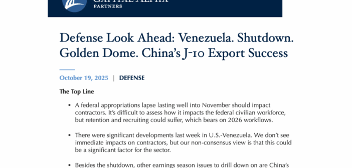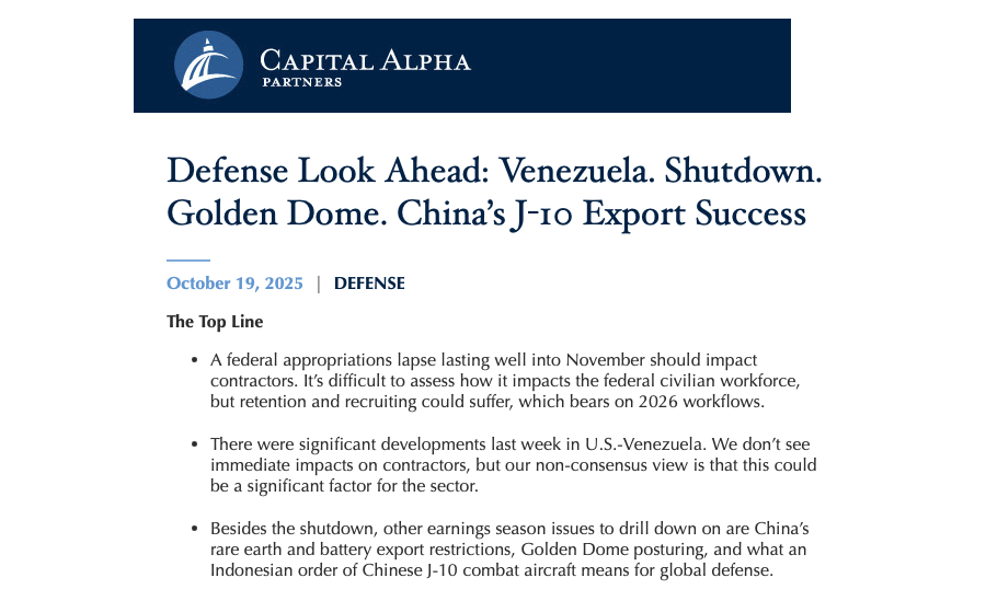 On today’s Look Ahead program, sponsored by HII, Byron Callan of the independent Washington research firm Capital Alpha Partners joins Defense & Aerospace Report Editor Vago Muradian to discuss the government shutdown; the Treasury Department’s September statement and Secretary Scott Bessent’s comments on defense industry share buybacks; Trump-Putin meeting and impact on Ukraine war; prospect Washington would buy Ukrainian drones and other weapons; US military operations in the Caribbean; takeaways from the Association of the United States Army’s conference and tradeshow, the Wharton Aerospace meeting, and the defense edition of Joanna Speed’s Aerospace Event in Washington; and a look at the week ahead. Our AUSA coverage was sponsored by Lockheed Martin and we are a proud media sponsor of the defense edition of the Aerospace Event.
