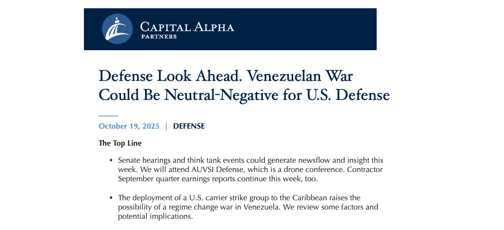 On today’s Look Ahead program, sponsored by HII, Byron Callan of the independent Washington research firm Capital Alpha Partners joins Defense & Aerospace Report Editor Vago Muradian to discuss the government shutdown; Venezuela war watch as Washington sends a super carrier to the Caribbean; takeaways from third quarter earnings reported by prime contractors, supplier firms as well as services companies; his US-China trade talks could change rare earths availability as leading firms like Lockheed Martin and Leonardo DRS warn of impacts; outlook for Pentagon spending; takeaways from the Depuy Institute’s Historical Analysis Conference; and a look at the week ahead.