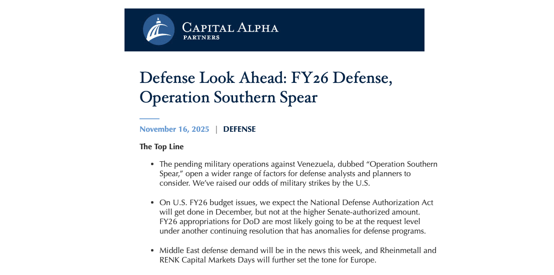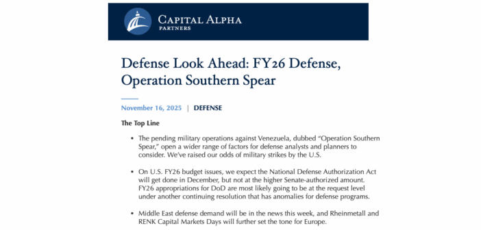 On today’s Look Ahead program, sponsored by HII, Byron Callan of the independent Washington research firm Capital Alpha Partners joins Defense & Aerospace Report Editor Vago Muradian to discuss progress on the National Defense Authorization Act and appropriations now that the US government shutdown is over; Army Secretary Dan Driscoll’s comments last week critical of heritage contractors and his desire to buy 90 percent of what the service needs through commercial sources; implications of NATO and Britain moving away from special mission US aircraft in favor of European options; Germany’s rising defense spending as well as takeaways from Hensoldt, Renk and other German firms; likelihood US will strike Venezuela; and a look at the week ahead.